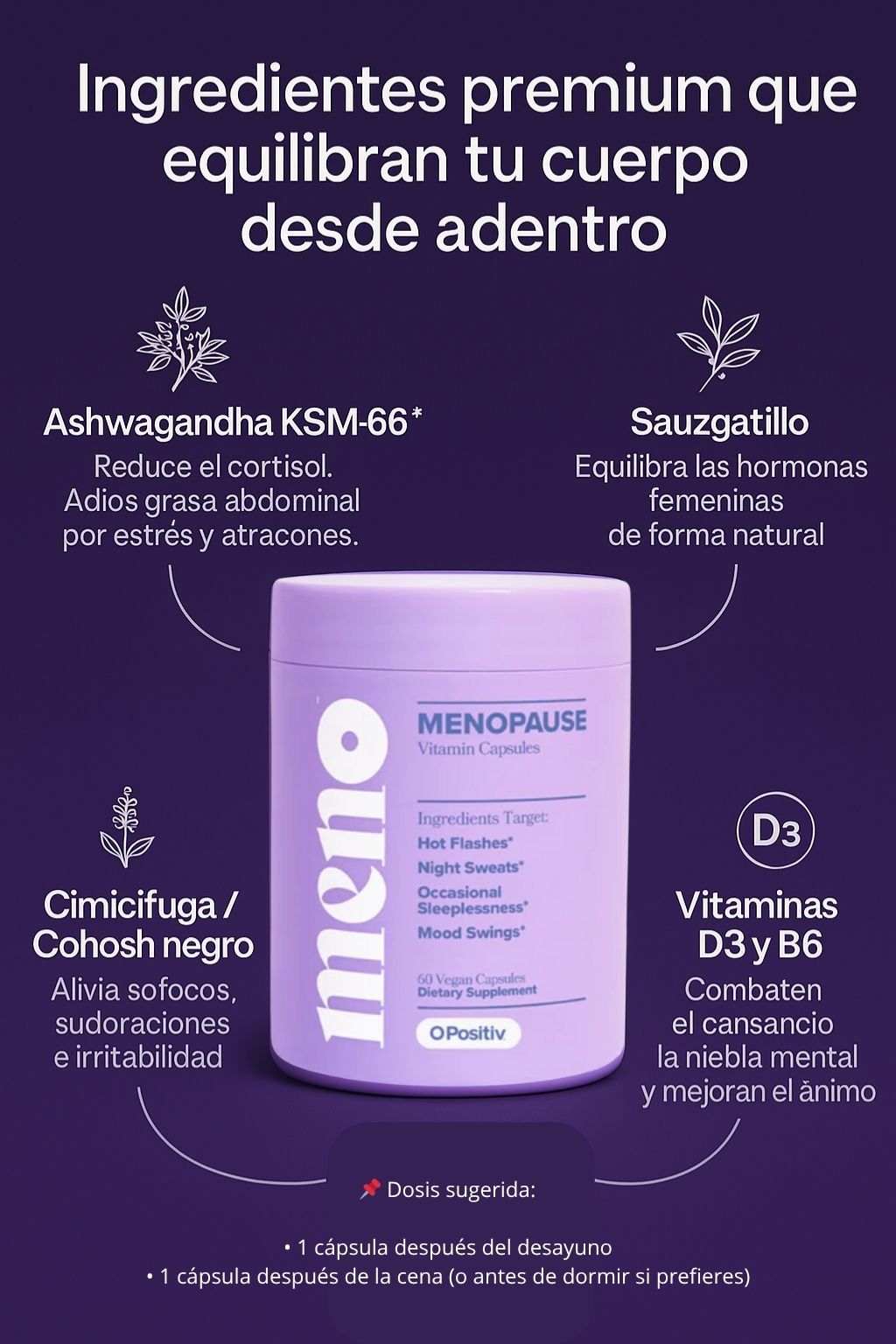 MENO no es solo un suplemento; es una fórmula integral diseñada científicamente para mujeres mayores de 45, que ataca las TRES principales causas de tu malestar: